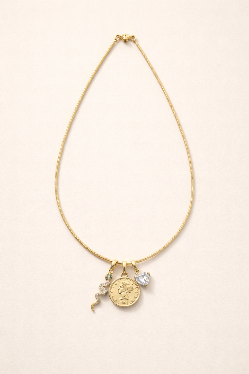 Unlike traditional chains, the structured wire silhouette maintains its elegant curve, allowing the necklace to sit beautifully along the neckline while highlighting the charm composition at the center. The coin pendant introduces a touch of classical inspiration, while the serpent and crystal charms add subtle movement and modern contrast.